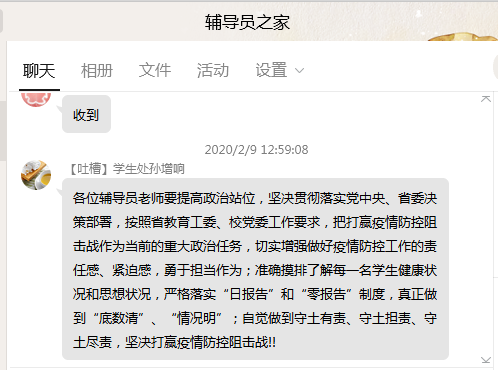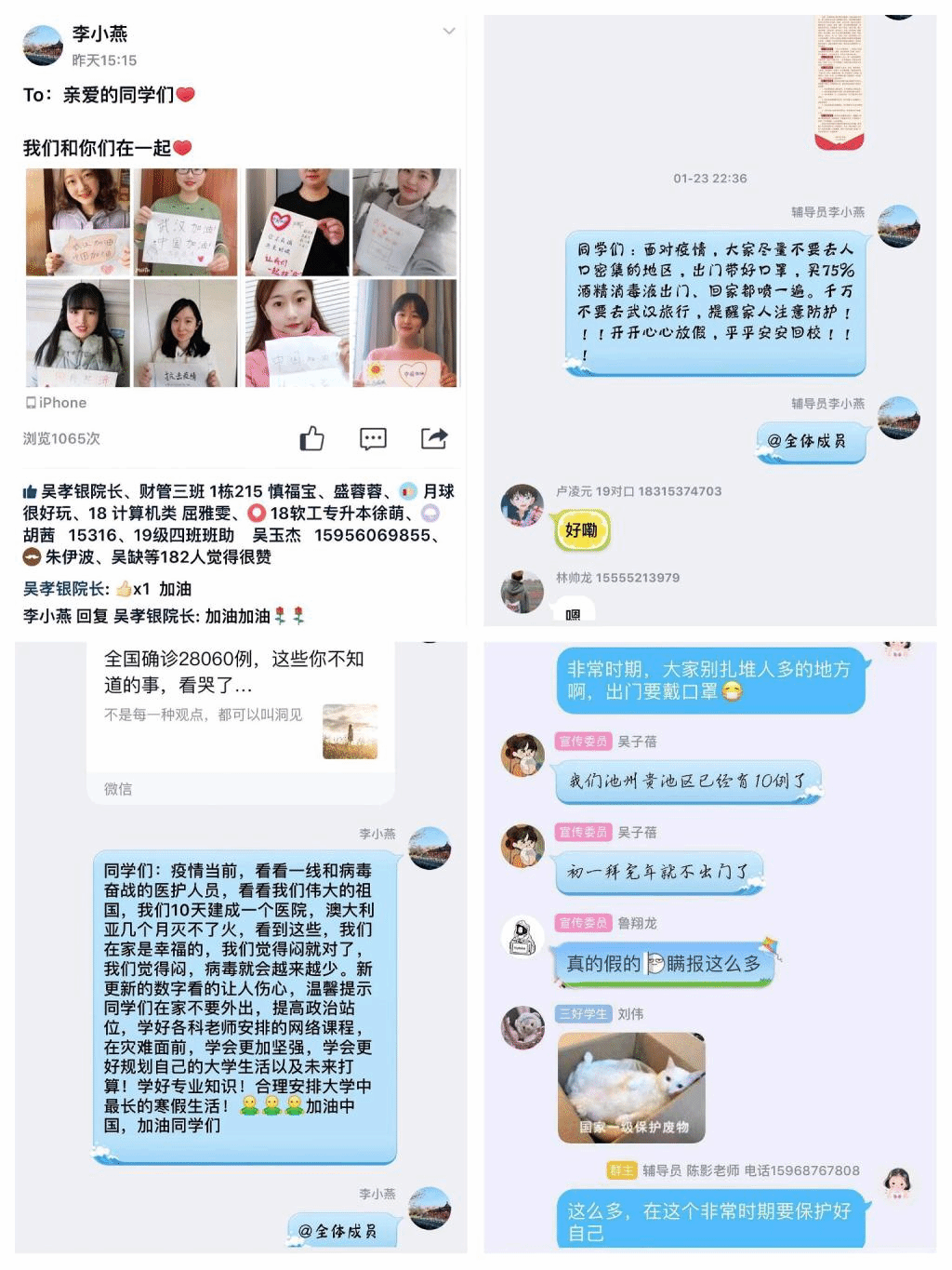 疫情就是命令,防控就是责任。 疫情发生后,学生工作部门高度重视,迅速成立学生疫情防控和应急处置工作组,全校学生工作队伍齐上阵,从“春节状态”直接转入“战疫模式”,积极协同学校相关单位,做好学生疫情防控指导和突发疫情应急处置工作。学校构建了“学校-学院-辅导员-学生”四级联动疫情防控工作机制,充分发挥辅导员、班主任和学生骨干的作用,齐心协力确保各项工作落实和信息统计有效畅通。连日来,全校学工干部置顶疫情防控微信群和QQ群,24小时保持通讯畅通,按照“全覆盖、无遗漏”工作目标,通过网络和电话隔空叮嘱每一位学子,及时了解掌握学生假期等学习生活动态。