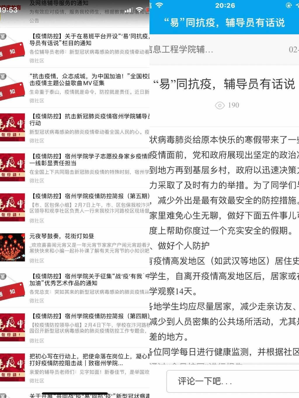 学工人充分发挥新媒体矩阵优势,通过“易班”教育平台开展新型冠状病毒感染的肺炎预防知识竞赛,宣传和普及防疫知识;开设“易”同抗疫,辅导员有话说栏目,持续开展疫情防控宣传和思想舆论引导,以辅导员关怀、学生自我教育、典型引领示范的方式,提醒学生注意科学防疫,理性辨别谣言,传播正能量,坚定抗疫信心。