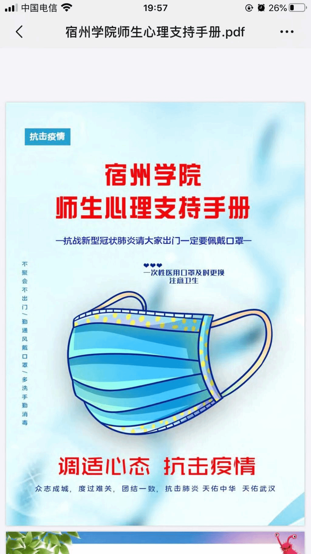 校心理健康咨询中心于1月30日开通心理支持热线及心理咨询服务;及时推出《宿州学院师生心理支持手册》,专业化指导师生开展交流要点要策。分门别类组织心理中心专兼职咨询老师全面投入全校师生心理服务队伍。确保广大师生正确看待、合理应对此次疫情,为全体师生穿上心理“防护衣”,共同打赢疫情防控攻坚战。