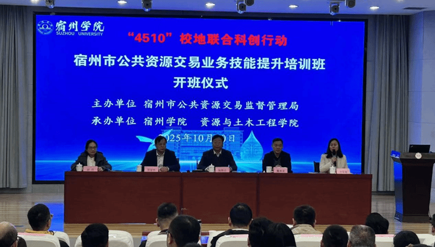 10月30日上午,宿州市2025年公共资源交易业务技能提升培训班开班仪式在宿州学院教育园区举办。宿州学院党委常委、副校长杨维志,宿州市公共资源交易监督管理局党组成员、副局长戴香龙,资土学院院长方雪梅、继续教育学院院长周家华、就业与校地合作处副处长赵丹等出席会议。本次培训由宿州市公共资源交易监督管理局主办,宿州学院资源与土木工程学院承办。