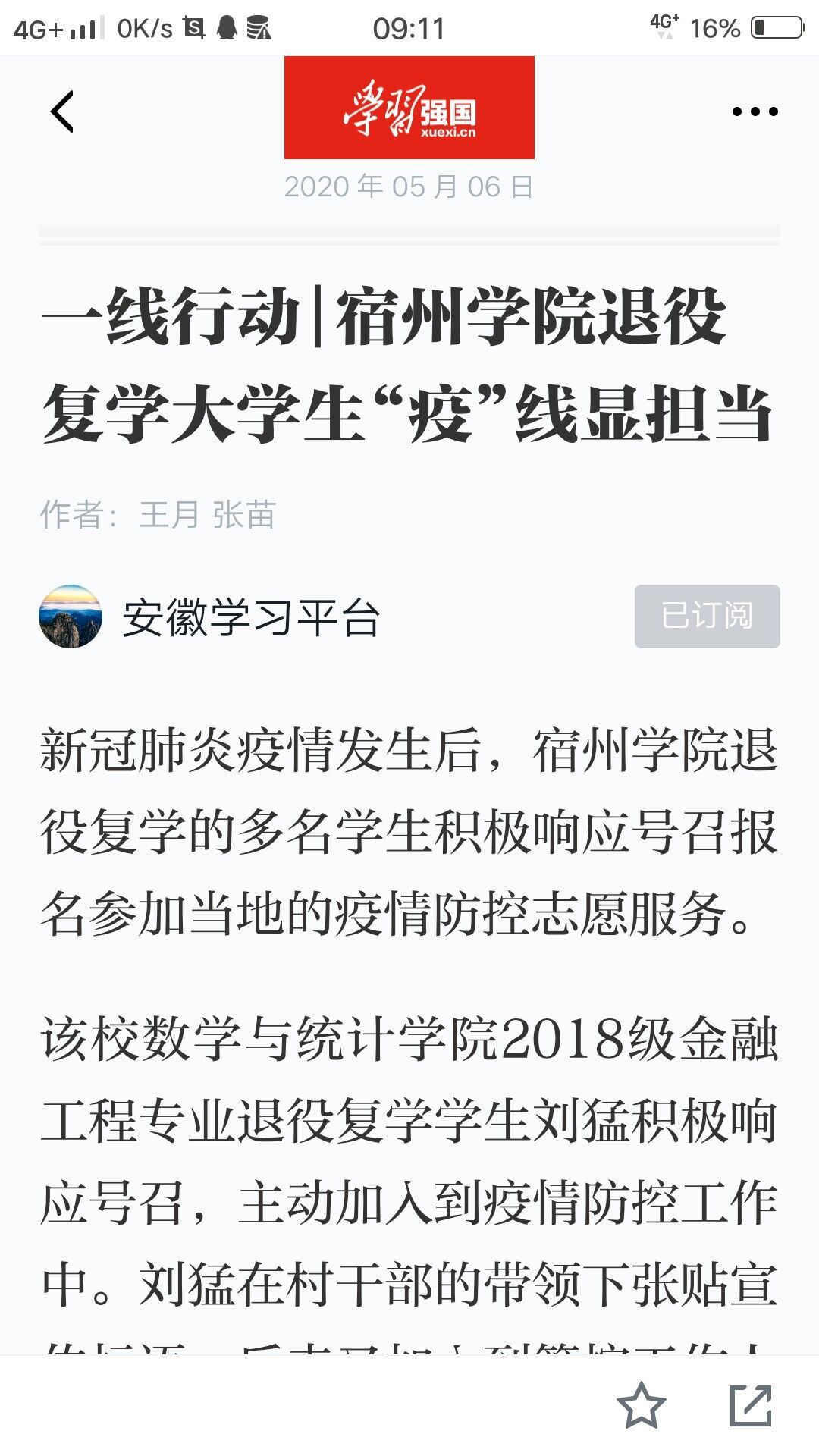 5月6日,《学习强国》以《宿州学院退役复学大学生“疫”线显担当》为题,对我校退役复学大学生疫情防控期间,参加家乡疫情防控工作的消息进行了报道。