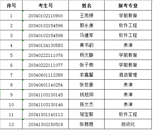 根据《宿州学院2020年面向中职毕业生对口招生章程》,经我校招生工作组审核,李艺文等1649名考生符合我校招生报名资格。另外,王雨婷等12名考生已完成缴费但尚未提交相关学籍证明材料(具体名单如下表)。