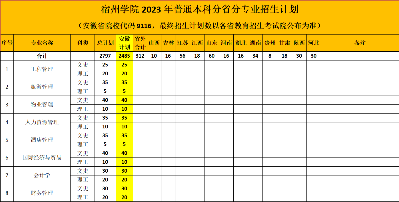 按照教育部分省分专业招生计划编制精神,根据《宿州学院本科专业设置与调整管理办法》《宿州学院普通本科招生计划测算模型》,学校编制了《宿州学院2023年普通本科分省分专业招生计划》(不包含普通专升本、对口本科招生计划)《宿州学院2023年普通专科招生计划》。《宿州学院2023年普通本专科分省分专业招生计划》经学校相关会议研究决定予以批准并报省教育厅审核,现将《宿州学院2023年普通本专科分省分专业招生计划》公布如下(具体计划以各省教育招生考试院公布为准):