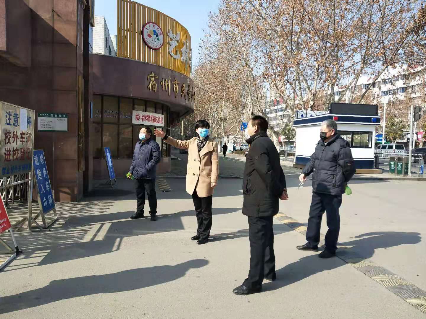 为贯彻落实宿州市新型冠状病毒感染的肺炎疫情防控工作领导小组办公室《关于建立领导干部包保小区疫情防控工作制度的通知》文件要求,进一步加强我校疫情防控,1月31日、2月2日,包保我校汴河路校区组长市人大常委会副主任孟广实、副组长市政协副主席张生在我校汴河路校区现场督促、检查、指导我校疫情防控和封闭管理措施落实情况。校党委副书记、校长张莉和党委委员、副校长李亮陪同检查指导。