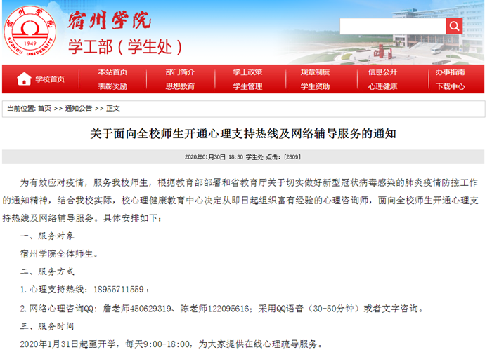 为有效应对疫情,服务学院师生,宿州学院心理健康教育中心自1月31日起为全院师生开通心理支持热线及网络辅导服务。