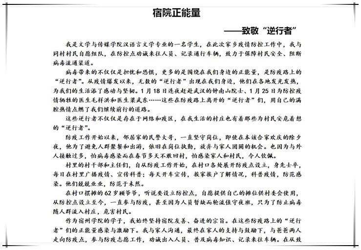 生命重于泰山,疫情就是命令,防控就是责任。2019级文化产业管理专业的团支书杨春荣,合肥市肥东县古城镇杨塘社区新农村大学生志愿者。作为一名大学在读的零零后,在得知延迟返校的信息后,她第一时间来到村党支部报名,申请加入疫情防控志愿者队伍。在村口主要交通要道,对来往车辆、人员进行排查、登记,协助对进出人员开展体温测量,并积极对社区内的邻里乡亲宣传疫情防控知识。有人问她,“你就不怕这病毒吗?”她回答:“怕也怕,但我更希望大家平平安安、健健康康。这是大学生活的第一个寒假,虽然不知道志愿工作会持续多久,但我会一直坚持下去的,给自己的人生交一份完美的“寒假作业”。2017级汉语言文学专业的郭雪梅,六安市金寨县梅山镇百禄桥村大学生志愿者。在家人的支持与鼓励下,与父亲一同走向防疫点,参与防疫志愿工作,劝诫出入人员、普及病毒知识、记录来往车辆。在从致敬“逆行者”到成为“逆行者”的转变中,争取为村民做出贡献,为宿院添光增彩,发挥自己的光和热,奉献自我、护卫他人。