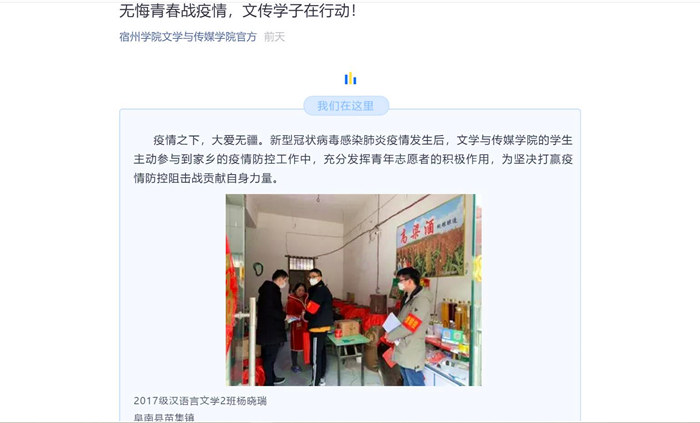 据悉,在得知14位同学参与家乡疫情防控志愿工作以来,文学与传媒学院团总支书记第一时间与14位志愿者取得联系,了解他们个人的身体健康状况和参与志愿的概况,并建议他们将志愿期间的所见所闻所感用文字、图片和短视频记录下来。目前,志愿者以提供志愿服务收获文字十余篇,这些文字大力宣传基层防控疫情的积极作为,弘扬紧紧依靠人民群众抗击疫情的坚定信念,传递万众一心、众志成城的正能量。同时,文传学院党总支建立了“文传疫情防控志愿者群”,学院处级领导干部进群与志愿学生保持及时联系,提醒志愿者加强自我防护,加强学习,遵守纪律,为基层防控疫情工作贡献自己的聪明才智。