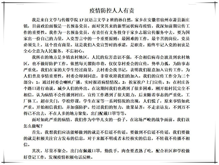此外,还有2018级文化产业管理专业的张佳东、赵紫琦、姚妍,2017级汉语言文学专业的杨晓瑞、孙自然、史丹、汪长肖、钱佩璇,2019级文化产业管理专业的金佳慧、蒋云吉,2019级汉语言文学专业的刘文力、向雯娟……他们中有的参加了家乡当地的防控工作,有的参加路口的检测工作,有的参加到防控知识宣传与普及,有的协助做好防控工作的服务保障工作,还有的捐款捐物,以各种形式支持和助力疫情防控工作。义无反顾的他们,用行动坚定着信念,用无畏书写着无悔,用真情撰写着人生。
