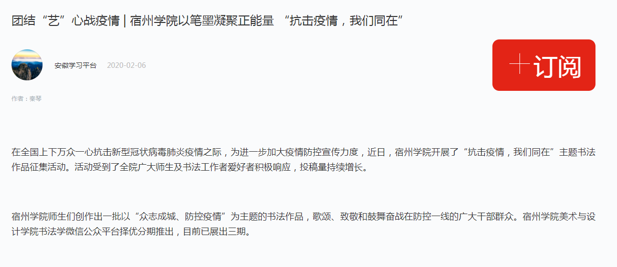2月6日,《学习强国》以《宿州学院以笔墨凝聚正能量 “抗击疫情,我们同在”》为题,对我校美术与设计学院开展“抗击疫情,我们同在”主题书法作品征集活动的信息进行了报道。