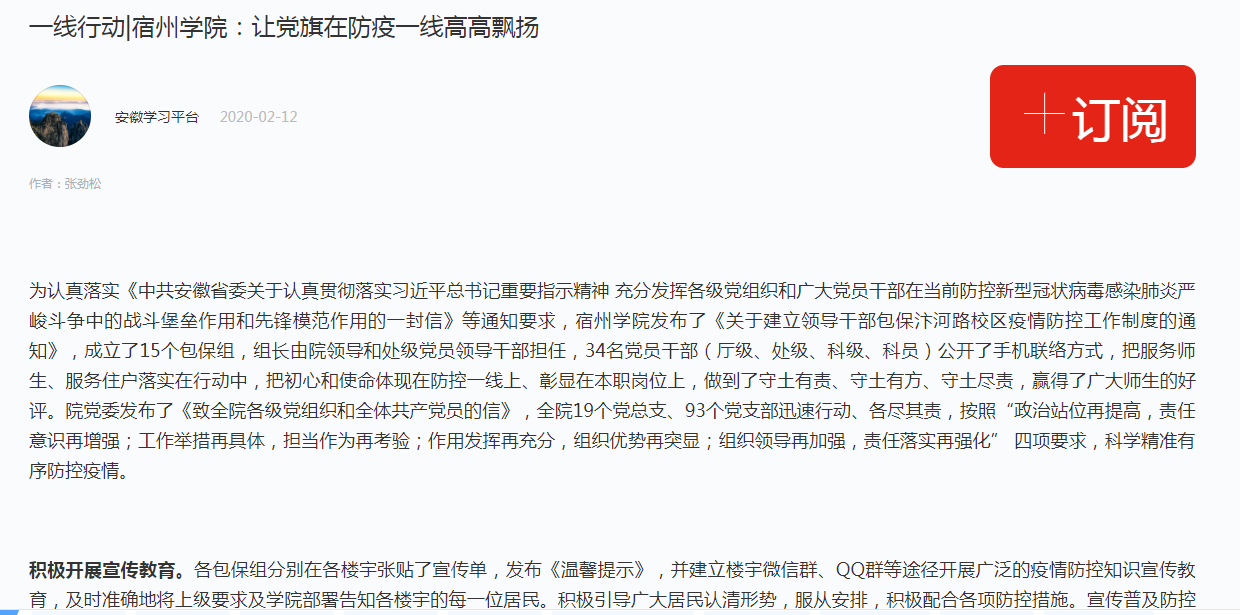 为认真落实《中共安徽省委关于认真贯彻落实习近平总书记重要指示精神 充分发挥各级党组织和广大党员干部在当前防控新型冠状病毒感染肺炎严峻斗争中的战斗堡垒作用和先锋模范作用的一封信》等通知要求,宿州学院发布了《关于建立领导干部包保汴河路校区疫情防控工作制度的通知》,成立了15个包保组,组长由院领导和处级党员领导干部担任,34名党员干部(厅级、处级、科级、科员)公开了手机联络方式,把服务师生、服务住户落实在行动中,把初心和使命体现在防控一线上、彰显在本职岗位上,做到了守土有责、守土有方、守土尽责,赢得了广大师生的好评。院党委发布了《致全院各级党组织和全体共产党员的信》,全院19个党总支、93个党支部迅速行动、各尽其责,按照“政治站位再提高,责任意识再增强;工作举措再具体,担当作为再考验;作用发挥再充分,组织优势再突显;组织领导再加强,责任落实再强化” 四项要求,科学精准有序防控疫情。