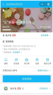本次“青春战疫,你我同行”—“ 云”修身志愿打卡活动以其独特的活动形式、趣味盎然的活动内容,赢得广大同学的积极响应,共有6000余人次参与活动。目前,活动签到进程稳步推进,签到率达95%以上,广大同学在自我提升的同时,也通过活动平台分享着在家中的趣味日常,表达对父母的感恩,部分家长也参与到活动中来,进行活动分享与讨论。