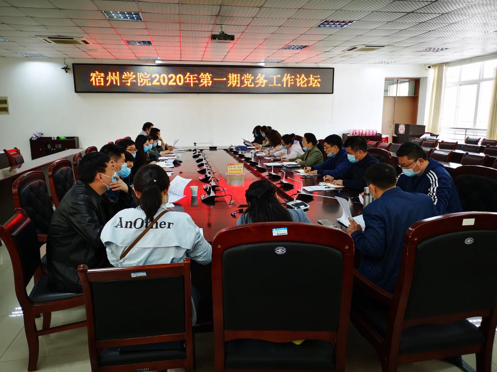 为做好第32期入党积极分子在线培训,落实好2020年发展党员指导性计划,落实《宿州学院基层党支部建设“提质增效”三年行动计划(2019-2021年)》,巩固标准化规范化建设成果,推进基层党支部优质化特色化建设,4月17日上午,我校在逸夫楼第一会议室举办2020年第一期党务工作论坛。组织部部长陈啸吟、副部长张劲松及19个党总支组织员、党务工作者参加会议。会议由陈啸吟主持。