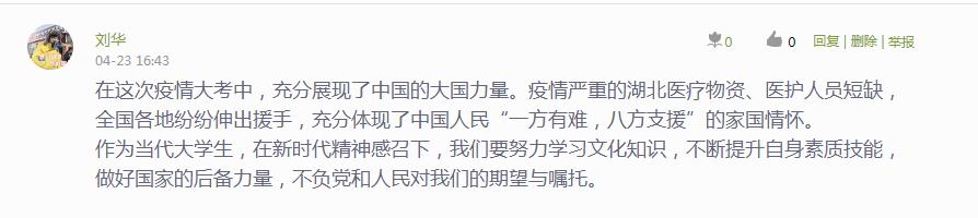 19级测绘1班的张文迪说:“作为新时代的中国青年,面对这场战疫,他们胸有大志、心有大我、肩有大任、行有大德,以青春的名义宣示了“不惧”“不退”的担当。这堂思政大课是对我们人生的引领,激励我们珍惜学习时光、练就过硬本领,回应时代呼唤,担负起时代赋予的使命和责任。”