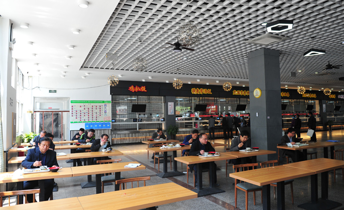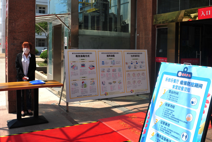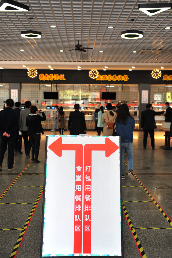 在学生食堂演练区,学生依次排队进行体温检测和手部消毒,无异常者方可进入。购买饭菜时,按地面标识间隔有序在售卖窗口排队等待,就餐学生全部同向、间隔而坐,用餐完毕后,戴好口罩收拾餐盘,有序排队将使用过的餐具摆放至餐具回收处,并在食堂出口处的洗手池洗手后离开。