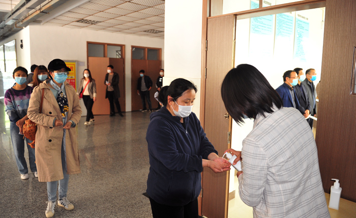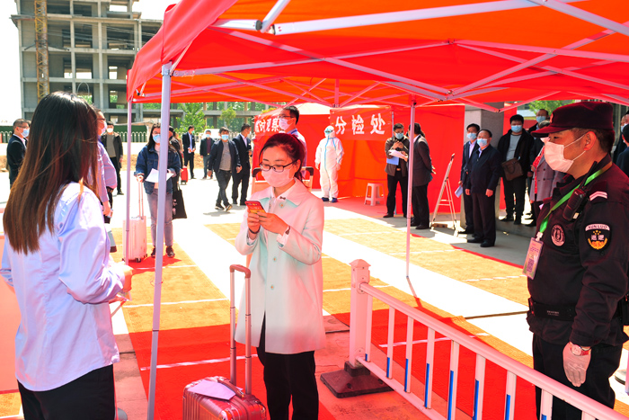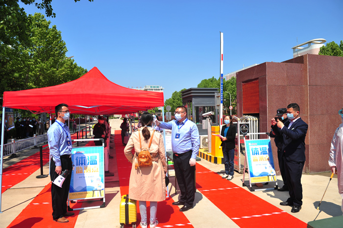 在学校南大门口演练区,“你好,请接受体温检测。温度36.5,体温正常,请通过”“你好,请扫描安康码。安康码扫描正常,请通过”“你好,请接受体温检测。温度37.5,体温异常。请后续队列暂停,引导员领至分检处接收检测,消毒人员前来消毒”类似这样的声音不断响起。学校大门的有效管控,是学校阻击疫情向校园蔓延、确保师生生命安全的第一道防线,在关键时刻发挥着关键作用。在学校南大门处,待入校学生需在校门口接受测量体温、扫安康码、足部消毒、手部消毒、行李消毒等几个步骤的检查、消毒,正常者,方可进入学校。演练现场,设置了人员进出通道2条。人员进出通道处,每一位学生在等待测温区保持1.5米距离有序排队,体温正常、无其他症状者,扫描安康码、消毒后方可进校;体温异常者,医护人员迅速将其带至临时观察点进行体温复测并登记信息。复测正常后,按照规定程序入校;复测仍然异常者,立即报告学校疫情防控领导小组,启动防疫应急处置程序,拨打120并陪送发热学生至定点医院就诊,相关人员随即对临时观察点进行消毒。