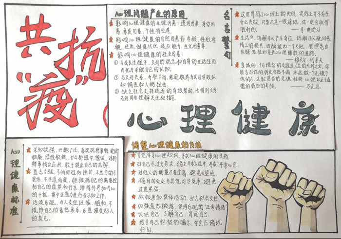6月19日,举办了“齐心抗疫·聆听心韵”手抄报大赛。参赛选手通过绘画手抄报的方式普及心理健康知识,运用合理的想象构思手抄报排版,精心设计画幅内容,用手中的画笔来传递能量。同学们将疫情防控与心理健康相结合,具体地展现了疫情防控期间当代大学生最真实的心理状况与情绪变化,并列举出了调节心理健康状况的合适的方法。