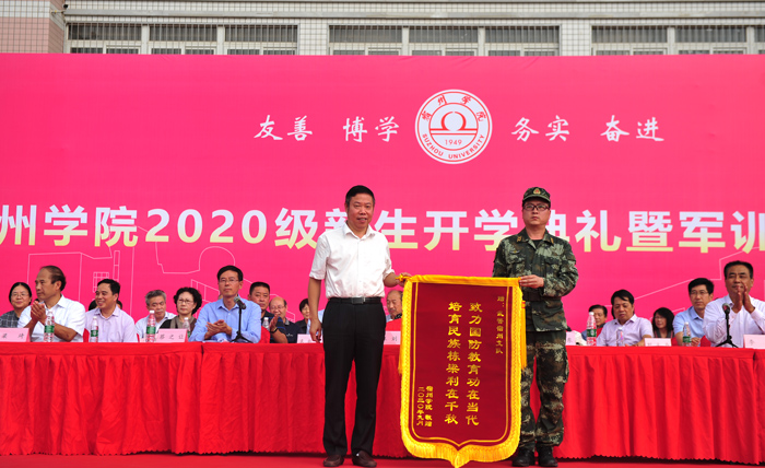 校党委书记汪刘送代表学校向军训部队赠送锦旗。