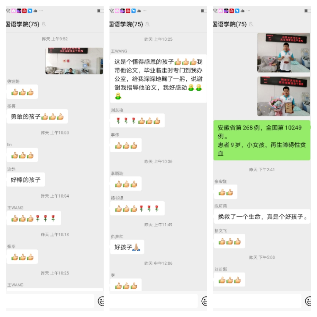 得知刘畅同学成功捐献造血干细胞后,我校外国语学院副书记、副院长郝景东通过电话和微信代表外国语学院向他表示了慰问,学院的师生们也都为他感到骄傲,纷纷给他点赞。