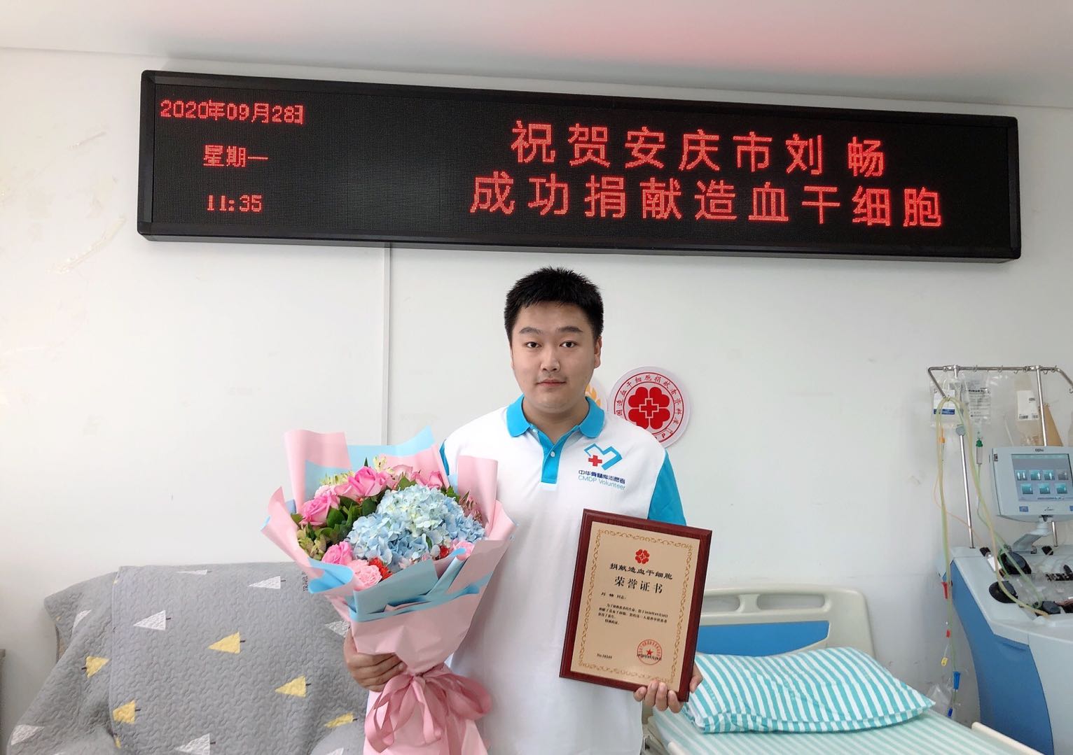 现年21岁的刘畅于2016年考入我校,就读于外国语学院英语专业,2020年7月毕业,目前是岳西县交通运输局的一名见习生。2018年3月22日,在宿州学院组织的无偿献血活动中,刘畅参加献血并采集血样加入了中华骨髓库。2020年8月,他接到安徽省红十字会的通知,他与一名9岁患再生障碍性贫血的小女孩初步配型成功,并征询他的捐献意愿。得知消息后,他欣然同意捐献造血干细胞,并在家人和单位的大力支持下,积极做好各项准备工作。9月23日,岳西县红十字会为刘畅举行欢送会,并送他入住中国科技大学附属第一医院(安徽省立医院),刘畅也成为岳西县首例造血干细胞捐献者。在注射9针动员剂后,于28日经过近三个小时采集了216ml的造血干细胞混悬液。随即这袋带着捐献者体温的“生命的种子”搭乘高铁送往患者所在的医院,将大爱传递到患者的体内。