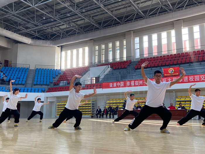 11月2日下午15:30,“健康中国.幸福宿州”——陈小旺太极拳进校园交流活动在宿州学院体育馆主馆举行,宿州学院党委委员副校长张英彦教授、体育学院党总支书记宋红军、宿州武术运动协会李健、张涛、体育学院全体师生及我校500余太极拳爱好者参加了本次活动,活动由体育学院院长徐连军教授主持。