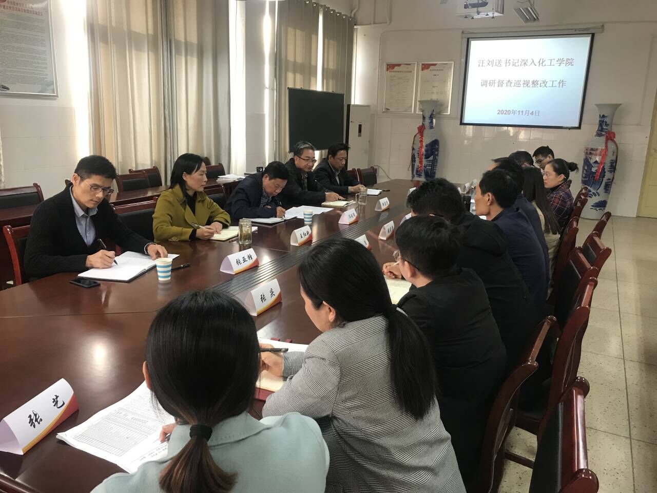 2020年11月4日下午,校党委书记汪刘送深入化学化工学院,就巡视反馈意见整改落实工作进行调研。化学化工学院领导班子成员、科级干部和教师代表参加调研座谈。