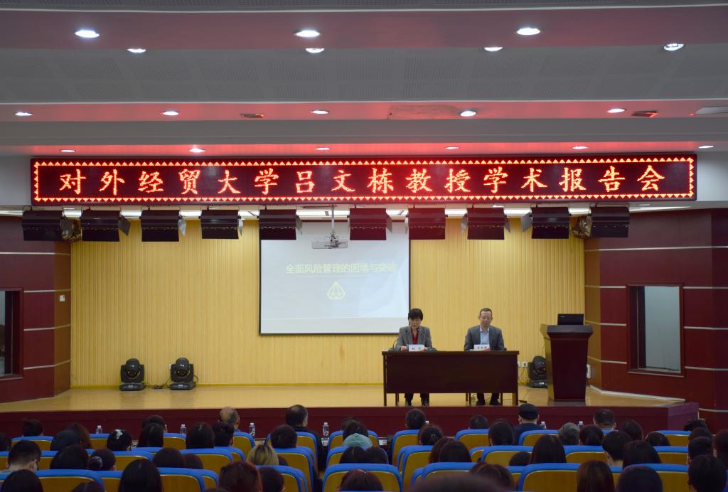 11月12日,应商学院邀请,对外经济贸易大学博士生导师吕文栋教授来我校讲学。吕文栋教授共作了《风险管理的困境与突破》、《期刊论文选题与撰写》、《企业风险管理》课程建设三场学术报告,来自安徽大学、安徽财经大学、淮北师范大学、淮南师范学院、蚌埠学院、亳州学院十余位老师、商学院部分师生及其他学院十余位教师参加学术报告会。报告会由张莉校长主持。