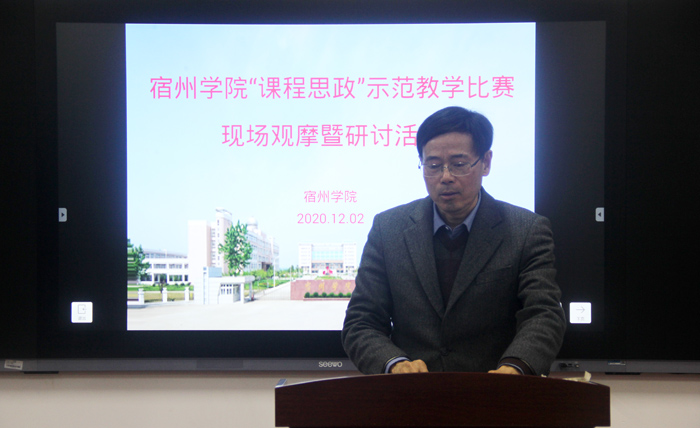 为充分发挥专业课程的思想政治教育功能,进一步提高教师的政治素养、业务素质和教学水平,推进“课程思政”建设工作,宿州学院依托教师课堂教学能力提升活动,结合“三全育人”综合改革试点,于12月2日下午,在教学楼A602开展了“课程思政”示范教学比赛现场观摩暨研讨活动。党委副书记、院长张莉,党委副书记蔡之让,党委委员、副院长李亮,党委委员、纪委书记、省监委驻学校监察专员王俊,党委委员、党委宣传部部长李真,质评处处长唐爱华出席活动;文学与传媒学院院长蒋宗霞、数学与统计学院党委副书记陈攀峰及各二级学院专业教师现场观摩此次活动。活动由文学与传媒学院党委书记李月云主持。