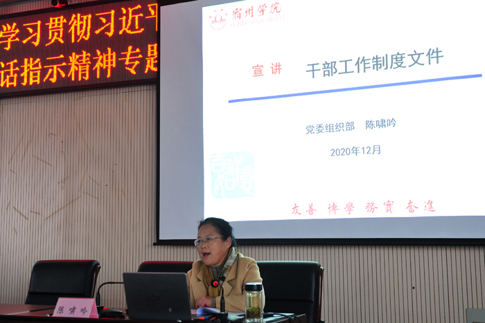 干部制度宣讲模块。12月4日下午,党委组织部部长陈啸吟对干部相关制度进行宣讲。解读了院党委近期出台的《关于进一步完善中层领导人员职业发展保障机制实施办法(试行)》《中共宿州学院委员会关于适应新时代要求大力发现培养选拔优秀年轻干部的实施办法》等7项制度,宣讲了我院干部工作的一系列新思路新要求新举措。