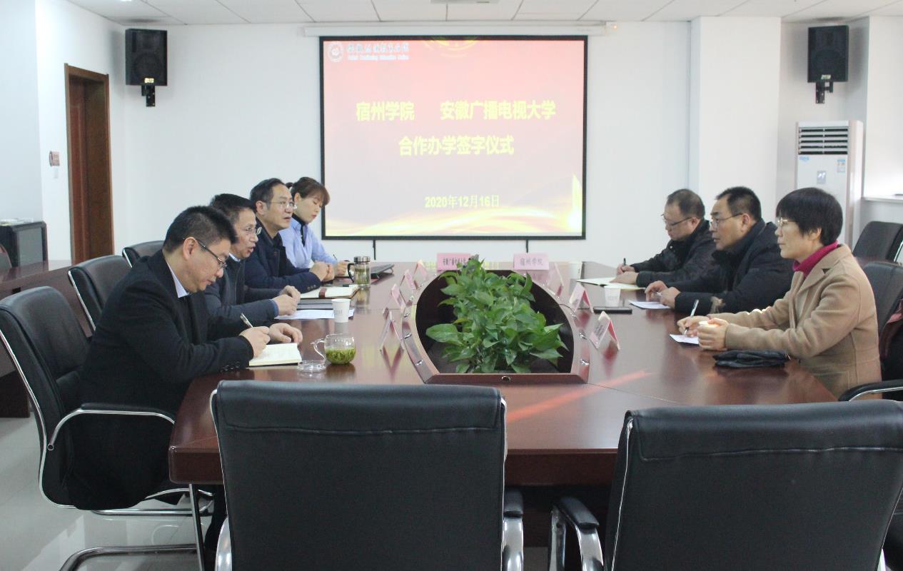 12月16日,宿州学院与安徽广播电视大学合作办学协议签字仪式在安徽广播电视大学远程教育大厦1903会议室召开。安徽广播电视大学党委委员、副校长朱彤,安徽继续教育网络园区管理中心主任李翔、副主任钱丰收,宿州学院党委委员、副院长李亮,宿州学院继续教育学院院长张雁凌、副院长甘守飞参加签字仪式。李亮、朱彤分别代表两校在合作协议上签字。