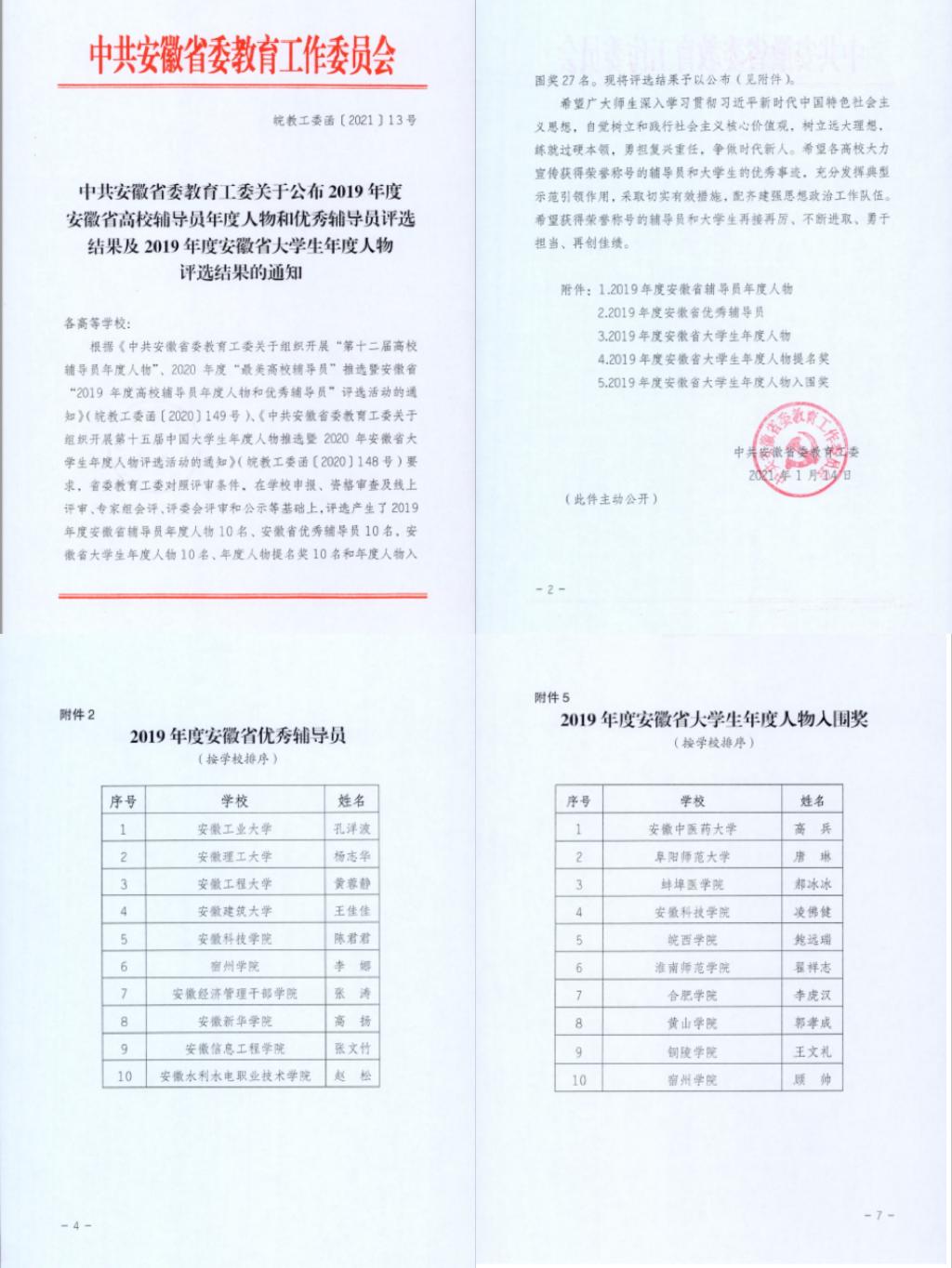 此次评选活动,学院党委高度重视,学生处、团委积极组织遴选优秀典型。在学校申报、资格审查、专家组评议、评委会评审等基础上,全省共遴选10名“2019年度全省高校辅导员年度人物”,10名“2019年度全省高校优秀辅导员”;10名“2019年度安徽省大学生年度人物”,10名“2019年度安徽省大学生年度人物提名”以及27名“2019年度安徽省大学生年度人物入围”奖。