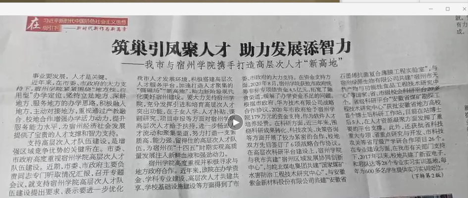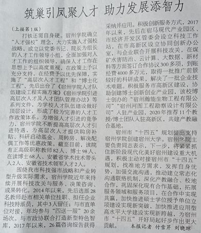 3月1日,《拂晓报》以《筑巢引凤聚人才助力发展添智力——我市与宿州学院携手打造高层次人才“新高地”》为题,报道了宿州市与我院携手打造高层次人才“新高地”。