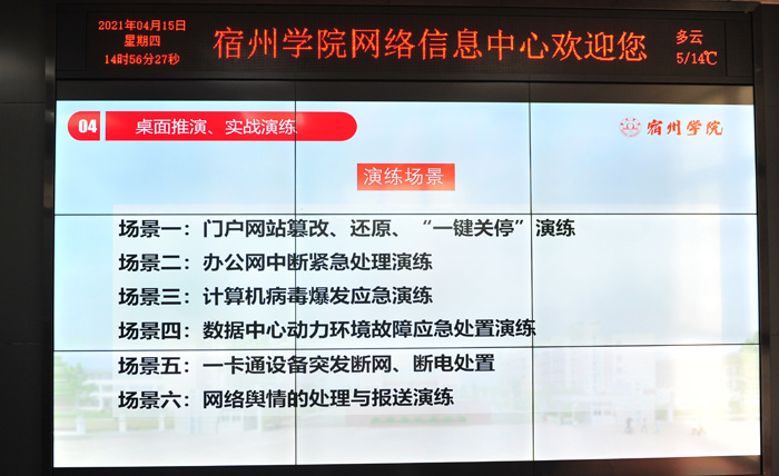 为进一步提升我院网络安全应急处置能力及协作水平,营造安全稳定的校园网络环境,在4月15日第六个全民国家安全教育日来临之际,我院与宿州市公安局网安支队在教育园区校区逸夫楼“智慧校园运维服务中心”共同开展了2021年上半年网络安全应急演练。宿州市公安局网安支队相关领导,院党委委员、副院长李亮,宣传部、保卫处、办公室(网络与信息中心)等部门负责人及工作人员参加了应急演练,应急演练由办公室主任李高主持。