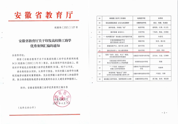 近日,安徽省教育厅下发《关于印发高校勤工助学优秀案例汇编的通知》(皖教秘〔2021〕127号),我院选送的勤工助学案例《强化劳动育人助力教育资助》被遴选为安徽省高校勤工助学优秀案例,在全省高校推广学习。