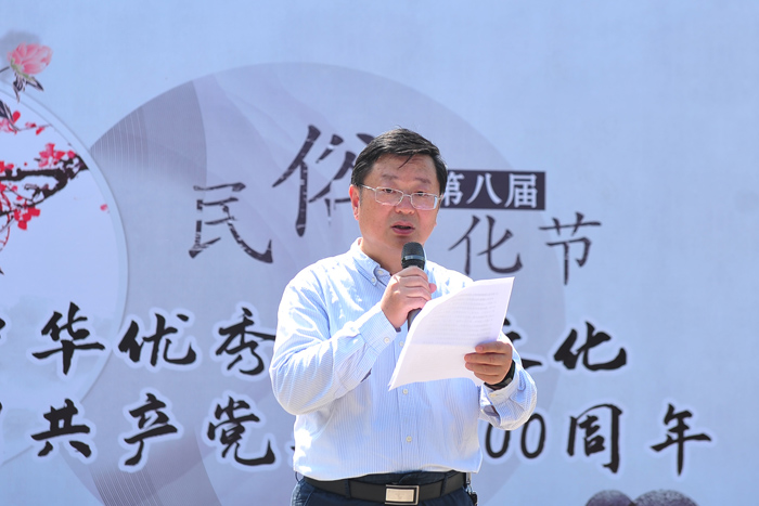 张英彦在开幕式致辞中介绍了宿州学院民俗文化节的发展历程,他指出,民俗文化节自2012年首次举办以来,除2020年受疫情影响没有按期举办外,已成功举办了七届,经过多年的实践探索和完善,民俗文化节不仅成为五个学院专业实践成果的展示会、交流会,也成为民俗文化交流和展示的重要载体和平台。他指出,民俗文化节丰富了学校文化育人内容,扩宽了文化育人的实践途径,已经成为弘扬学校大学文化、展示文化育人办学特色的最重要的品牌特色活动之一。最后他强调,本届民俗文化节以“弘扬中华优秀传统文化,庆祝中国共产党建党100周年”为主题,以传统艺术形式为载体,传承弘扬红色文化、廉政文化尤为值得称赞,同学们通过参与民俗文化节,感受劳动创造的获得感和幸福感,进一步引导青年学子树立正确的民族观、历史观、价值观,增强师生的民族自尊心、自信心和自豪感,积极主动地将民族精神、民俗文化的传承与理想信念和价值坚守的涵养结合起来,做担当民族复兴大任的时代新人。