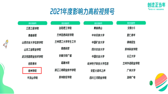 中青校媒根据各大高校视频号发布频次、内容质量、点赞数据等多维度综合考量,评选出“2021年度影响力高校视频号”,我院与中央民族大学、中国农业大学、中国矿业大学等70所高校视频号荣获“2021年度影响力高校视频号”称号。