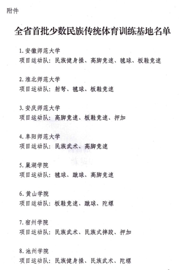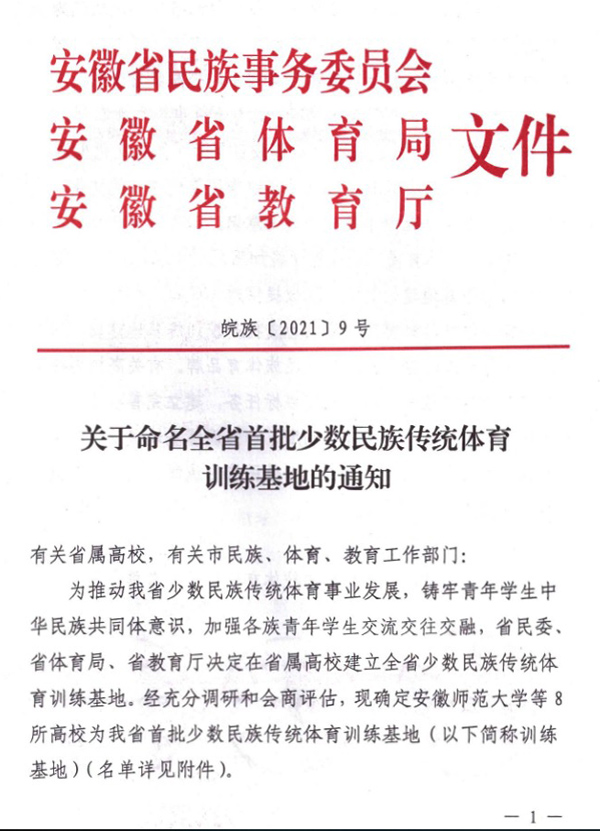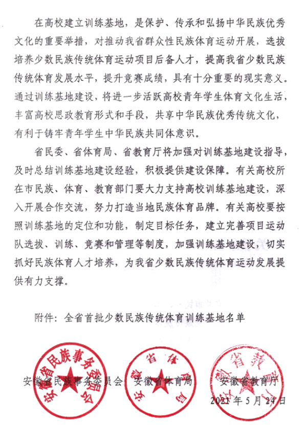 2021年5月24日,安徽省民族事务委员会、安徽省体育局、安徽省教育厅联合发文公布全省首批少数民族传统体育训练基地名单。经自主申报(由体育学院负责)、省教育厅推荐、专家实地考察遴选等环节,宿州学院申报首批少数民族传统体育训练基地成功获批。这是我校积极推动高校体育文化开展、丰富高校思想政治教育形式和手段取得的标志性成果。
