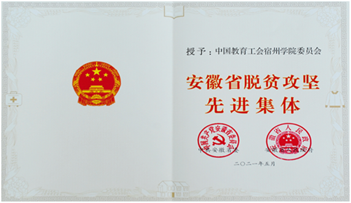 5月28日,在安徽省脱贫攻坚总结表彰暨巩固拓展脱贫攻坚成果同乡村振兴有效衔接工作推进大会上,宿州学院工会被省委、省政府授予全省脱贫攻坚“先进集体”荣誉称号。这是我院连续在2018、2019、2020年度省直单位定点扶贫工作成效考核为“好”等次后,获得的又一荣誉,也是我院定点扶贫工作获得的最高荣誉。