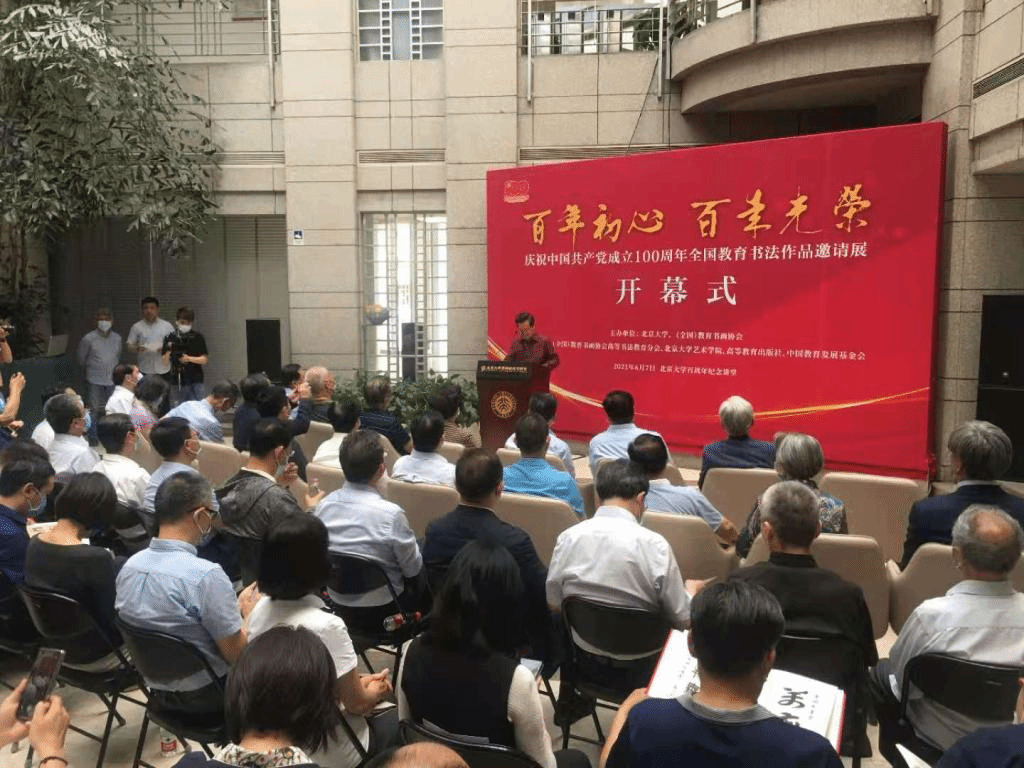 2021年6月7日下午,由(全国)教育书画协会和北京大学共同举办的“百年初心·百年光荣——庆祝中国共产党成立100周年全国教育书法邀请展”在北京大学开幕。共有来自全国教育界的158位书法名家应邀参展。