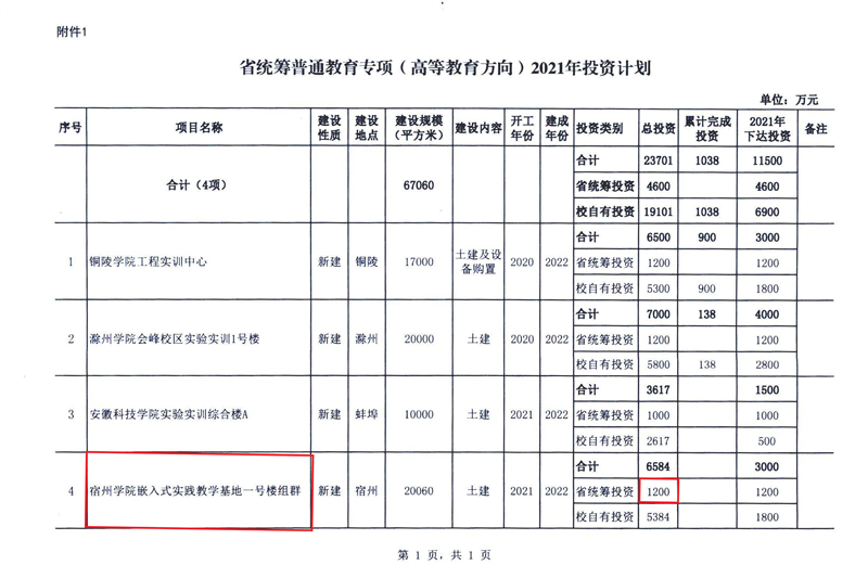 近日,安徽省发展和改革委员会下达皖发改投资【2021】161号文件,批准了我院关于嵌入式实践教学基地一号楼组群申请资金的请示,并随文下达省统筹普通教育专项(高等教育方向)投资计划,我院获得省统筹投资补助1200万元。