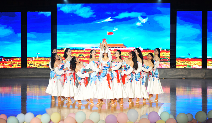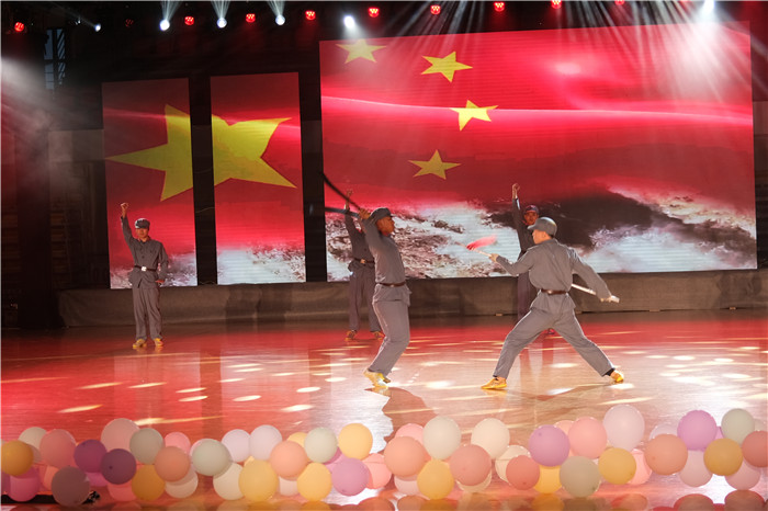 演出过程中,学生表演造型优美、新颖独特,充分展示出学生爱党爱国的情怀、锐意创新的精神、朝气蓬勃的风采以及扎实的实践应用能力和较高的综合素质。《热血华章》反映了新民主主义革命时期中国共产党历经磨难,带领中华儿女在拼搏中成长,在奋斗中前进,在争取民族独立和解放的历史进程中翻开热血华章。《万疆》歌颂党带领全国人民昂首走在中国特色社会主义的光辉道路上,中国万疆一派处处平安、祥和、幸福的美丽景象。《初心》则体现了中国共产党不忘初心,牢记使命,保持永不懈怠的精神状态和一往无前的奋斗姿态。《携笔从戎》反映了保卫祖国,巩固国防,不仅是军人的义务,也是全体青年大学生的责任,号召广大学子携笔从戎,积极投身于国防建设,共同创造祖国美好明天。《党旗下的青春》则体现了因为有党的坚强领导,才有了当代年轻人在富强美好的国度中幸福、健康、快乐的青春生活。《信仰》凸显了对马克思主义的信仰,对社会主义和共产主义的信念,是共产党人的政治灵魂,有信仰,才能绘就基本底色、构筑精神高地......演出精彩纷呈,带给观众们精神的洗礼和美的享受,现场掌声和喝彩声不断。