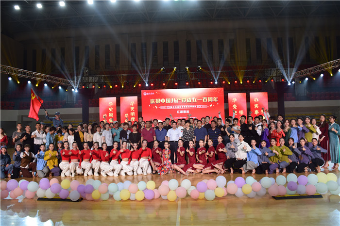 为庆祝中国共产党成立100周年,体育学院师生结合专业特点,编排了武术《热血华章》、舞蹈《初心》、健美操《党旗下的青春》等12个节目,引导师生学习党的光辉历史、感悟党的初心使命、传承党的红色基因,厚植爱党、爱国、爱社会主义的情感。在演出筹备的过程中,师生将作品创编的“舞台”变身党史学习教育的“讲台”,让党史学习教育活起来,让红色基因亮起来。