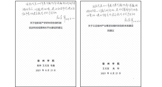 与会领导对宿州学院的发言和建议给予高度评价,认为宿州学院在调研任务完成过程中发挥了重要的作用,问题找的准、措施很有效、建议可行性高,并对吴玲教授和王元宝博士提交的专题报告,现场签批了意见,并希望宿州学院同市政协的智库合作继续保持,为加强校地合作贡献力量。