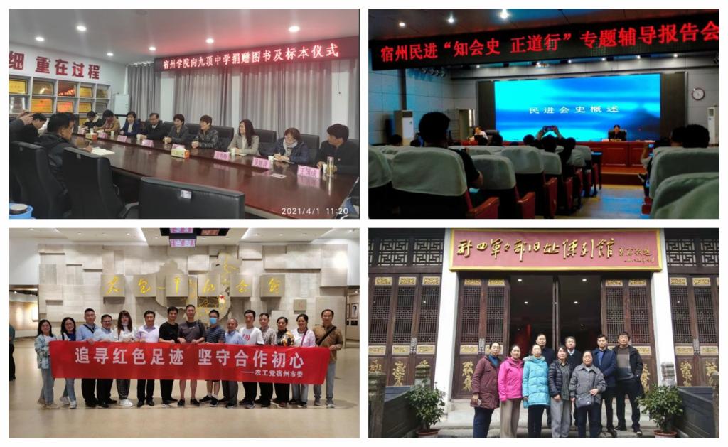 4月1日,九三学社宿州学院支社主委方雪梅、社员沈玉梅等一行前往灵璧县九顶中学开展公益捐赠图书及标本活动,沈玉梅还为九顶中学师生开展了党史讲座活动;九三学社社员还积极参加九三学社宿州市委举行的“学四史 忆初心 担使命”主题演讲比赛活动,我院教师、九三学社社员赵莺担任此次比赛主持人,我院教师、九三学社社员杨梅获得此次比赛二等奖。4月2日至4日,民盟宿州市总支第一支部(宿州学院支部)赴皖南开展了“不忘合作初心,继续携手前进”党史学习教育主题考察活动,重温民盟与中国共产党风雨同舟、亲密合作的光荣历程。民进宿州学院支部积极开展“学党史牢记使命,谋发展砥砺前行”主题活动,5月15日,邀请民进宿州市委主委孟方作“知会史·正道行”专题报告会。农工党宿州学院支部积极参与农工党宿州市直总支组织的各项党史学习教育,5月23日,农工党宿州学院支部部分党员参加了农工党宿州市直总支召开的党史学习教育座谈会;农工党党员曹少飞、徐国伟,曹少飞等还赴小岗村开展了党史学习教育。院侨联充分发挥侨界优势,积极参加“侨心永向党”安徽省侨联系统庆祝建党100周年文艺汇演暨皖港澳侨界书画展,院侨联报送的两幅书画作品在赖少其艺术馆参展,《祖国我的最爱》节目入选文艺汇演;精心组织一批优秀作品参加“同心永向党 共筑中国梦”——宿港澳台侨界书画展活动。