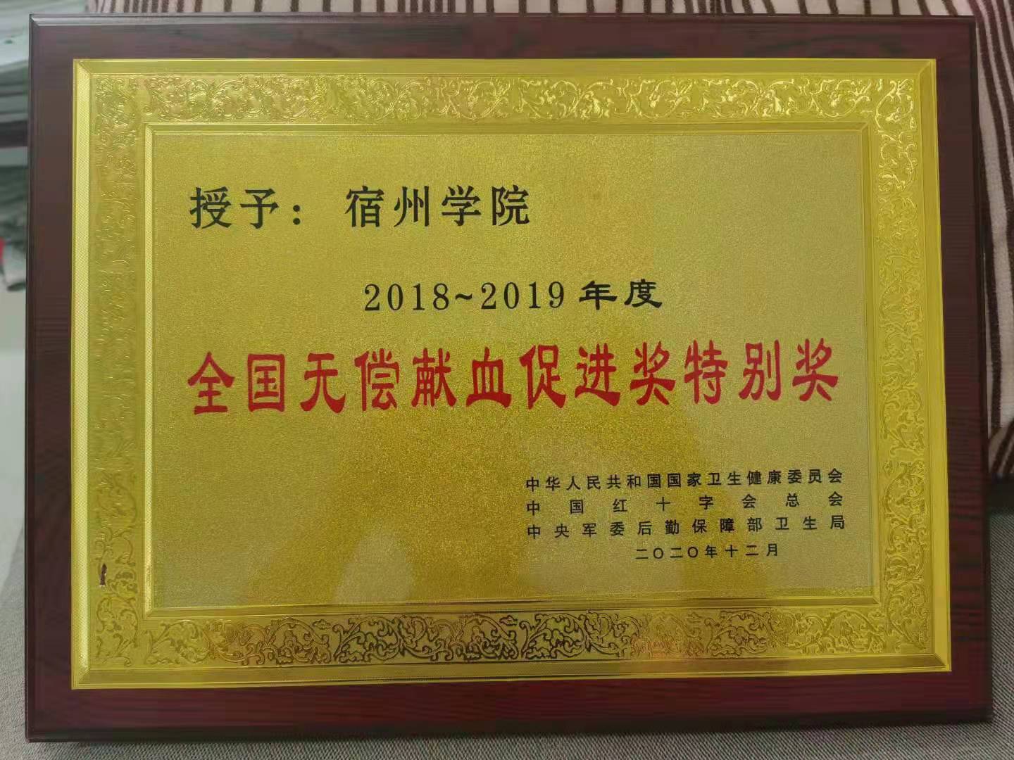 近年来,宿州学院每年都组织学生和教职工开展大型无偿献血活动,年献血量逐年上升。2018以来组织无偿献血宣传活动40多次,校园集体献血活动9次,无偿献血7831人次,共捐献全血156.62万毫升;400多人加入了中华骨髓库,其中3人成功捐献造血干细胞。学院荣获安徽省2019年无偿献血先进集体,梦雪同学被评为2021年度高校学生无偿献血先进个人,李明鑫同学获2021年度高校学生无偿献血先进个人入围奖。