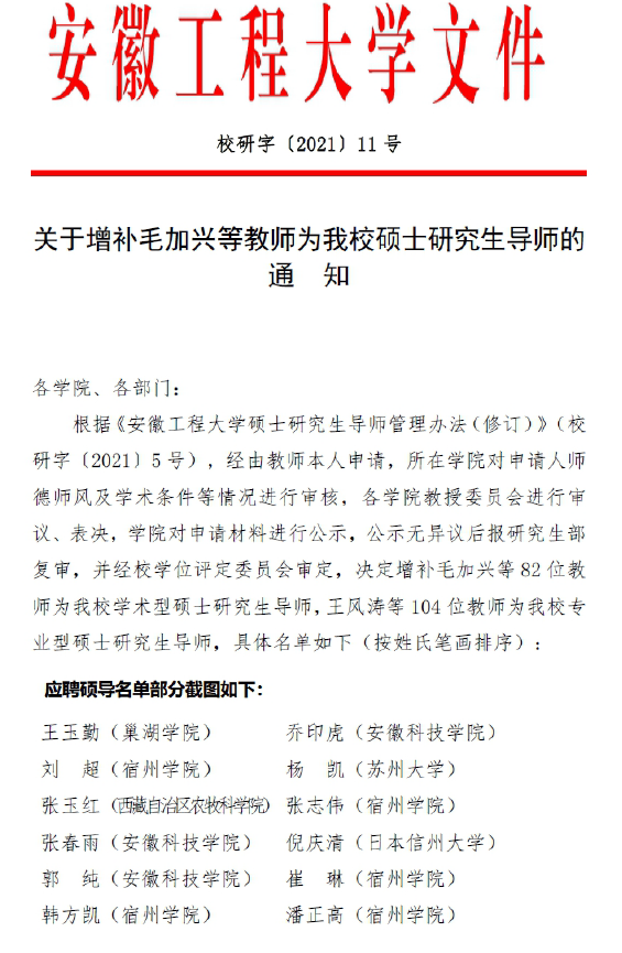 2021年9月5日,安徽工程大学发布了《安徽工程大学硕士研究生导师管理办法(修订)》(校研字〔2021〕5号)文件,公布了硕士研究生指导教师资格人员名单,我校信息工程学院崔琳教授、潘正高教授、张志伟副教授被聘为安徽工程大学学术型硕士研究生导师。此次聘任,对我校电子信息专业硕士点申报工作具有积极的推动作用。