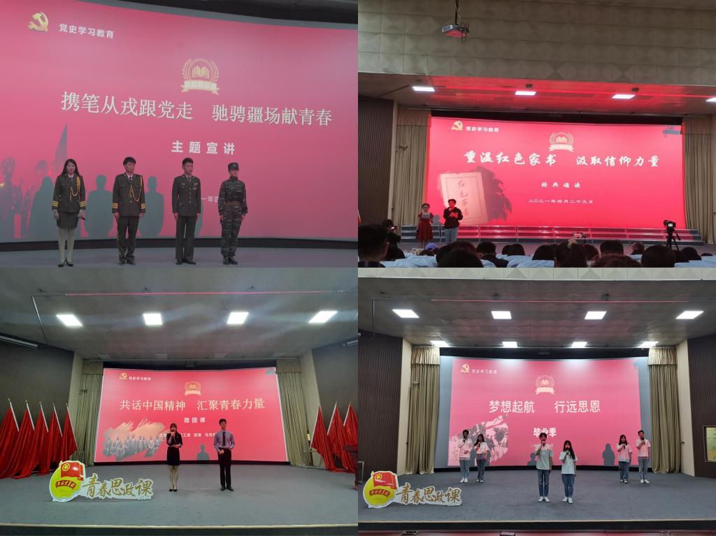 学生组织是党联系团员青年的桥梁纽带,要在党史学习教育中走在前列。校院两级学生组织多次专门开展理论学习,深入贯彻习近平总书记在党史学习教育动员大会上的重要讲话精神,并结合实际情况,谋划组织工作。基层团支部是组织开展党史学习教育的落脚点,学校聚焦抓在经常,突出“三会两制一课”,发挥“校—院—班”三级团组织书记作用,校团委书记班子深入团支部“讲团课”、院级团总支书记“教团课”、组织团支部书记“说团课”,引导团员青年在高质量的党史教育“团课”中了解党的光辉历史、感悟党的初心使命、领会党的创新理论、体认党的精神谱系、传承党的红色基因。