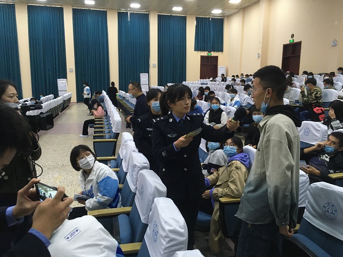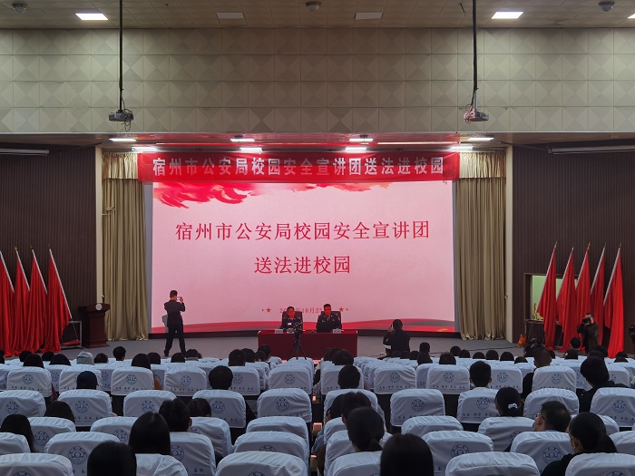 为落实安徽省及学校安全工作会议精神,进一步推进校园安全文化建设,增强学生的安全意识,增进自觉遵守法律法规的观念,养成安全文明的行为习惯。10月25日下午,学校邀请宿州市公安局校园安全宣讲团在大学生活动中心开展法治宣讲活动,宣讲活动吸引了拂晓报社、直播宿州等媒体的宣传报道。