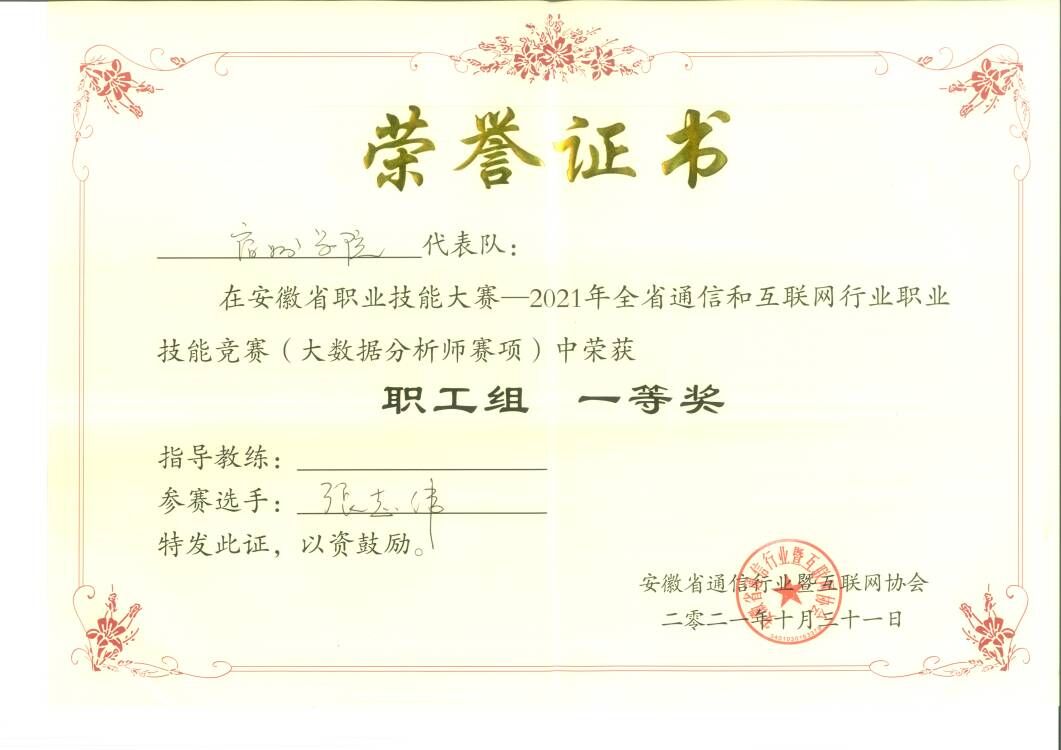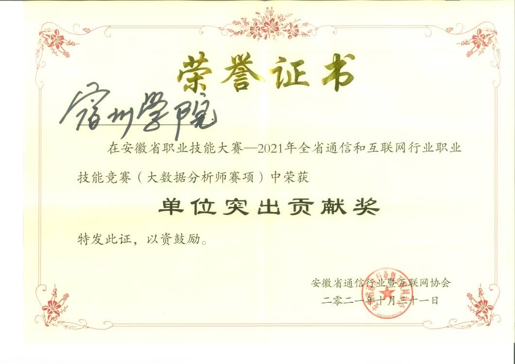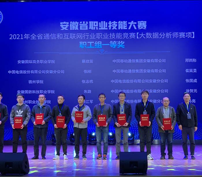 10月30-31日,由安徽省人社厅、总工会、通信管理局指导,安徽省通信行业暨互联网协会主办的安徽省职业技能大赛——2021年全省通信和互联网行业职业技能竞赛(大数据分析师赛项)在安徽国际商务职业学院成功举办。信息工程学院教师张志伟博士带领参赛教师和学生积极备战,荣获职工组一等奖一项,三等奖两项,本科学生组荣获二等奖一项,宿州学院荣获“单位突出贡献奖”。