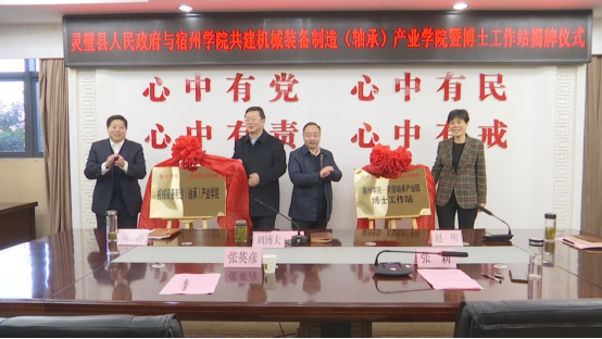 11月12日,灵璧县人民政府—宿州学院机械装备制造(轴承)产业学院暨博士工作站揭牌仪式在灵璧县政府会议室举行。灵璧县县委书记刘博夫、县委副书记、县长赵明、宿州学院党委副书记、校长张莉、党委委员、副校长张英彦共同为机械装备制造(轴承)产业学院和轴承产业园博士工作站揭牌。灵璧县副县长闵涛、灵璧经济开发区和部分县直单位负责人、宿州学院教务处处长王红艳、党委教师工作部副部长段鹏举、科研处副处长毛强、机械与电子工程学院科研副院长刘从虎及部分博士代表共同出席了揭牌仪式。