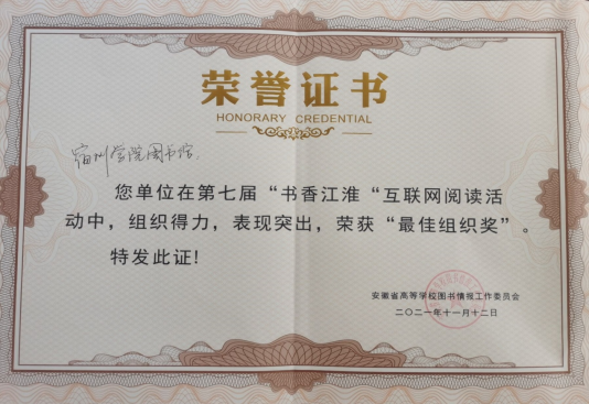 喜迎建党100周年,为了推动全民阅读活动持续深入开展,安徽省高校图书情报工作委员会联合全省各大高等院校,于2021年2月至2021年6月期间,举办第七届书香江淮“品读经典 对话信仰 弘扬社会主义核心价值观”互联网阅读系列活动。经过专家评审,共评选出:征文作品获奖者70名其中一等奖10 名,二等奖 20 名,三 等奖 40 名;最美阅读摄影奖 10 名;“经典在我心中”朗诵作品 20 篇进入现场决赛,现场评选出一等奖 1 名,二等奖 2 名, 三等奖 4 名;最佳组织单位 6 个;全能超人奖 1 名;最佳指导奖 1 个。此次比赛中,我院学生在图书馆阅读推广部老师及各学院老师的推动、指导下,积极参与活动,取得了征文比赛第三名、最美阅读摄影奖的好成绩;宿州学院图书馆荣获最佳组织奖。